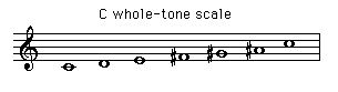 All the notes of the chromatic scale are spaced at equal (‘symmetrical’) , semitone, intervals. This scale is therefore a called a symmetric scale. One can also form a symmetric scale by selecting notes spaced at whole tone (2 semitones) intervals. This scale consists of six notes only and is called the Whole-tone scale.