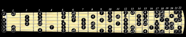 D pentatonique mineur, A blues, C Majeur Ionien, Fa Majeur Ionien, Ré mineur harmonique, C Majeur Ionien, La mineur harmonique, B Pentatonique majeure